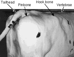 O escore de condição corporal é determinado por observação visual da anca da vaca primariamente a região delimitada pelos ossos do quadril (tuber coxae), (tuber ischii) e inserção da cauda. A quantidade do cobertura das vértebras no dorso é também usada. (Figuras 2, 3 e 4). As vacas são normalmente avaliadas numa escala de 1 a 5, sendo que para as vacas extremamente magras se atribui índice 1 e para as extremamente gordas, indice 5. (Figura 4)